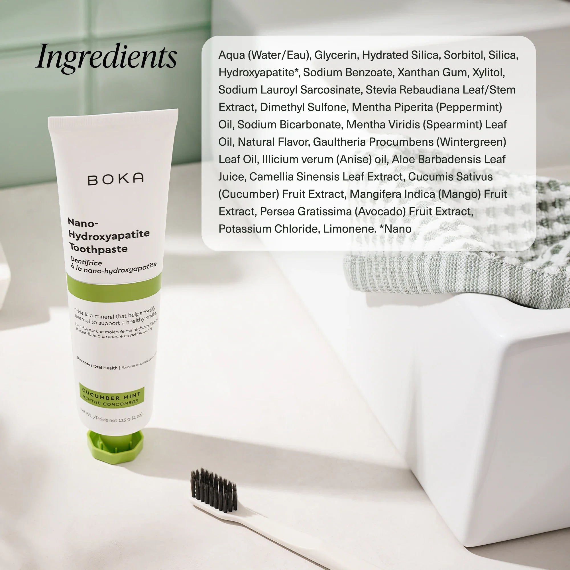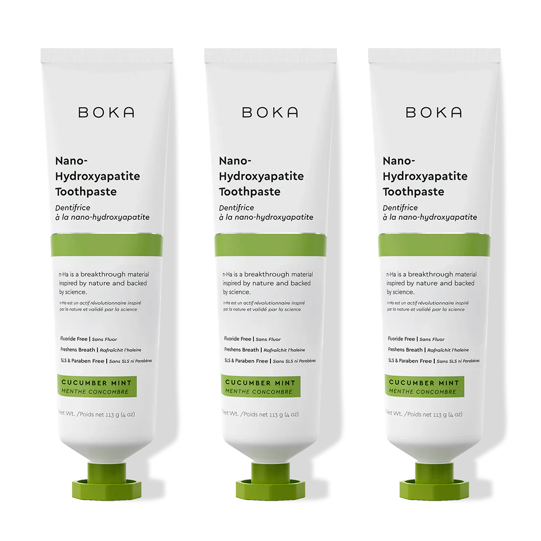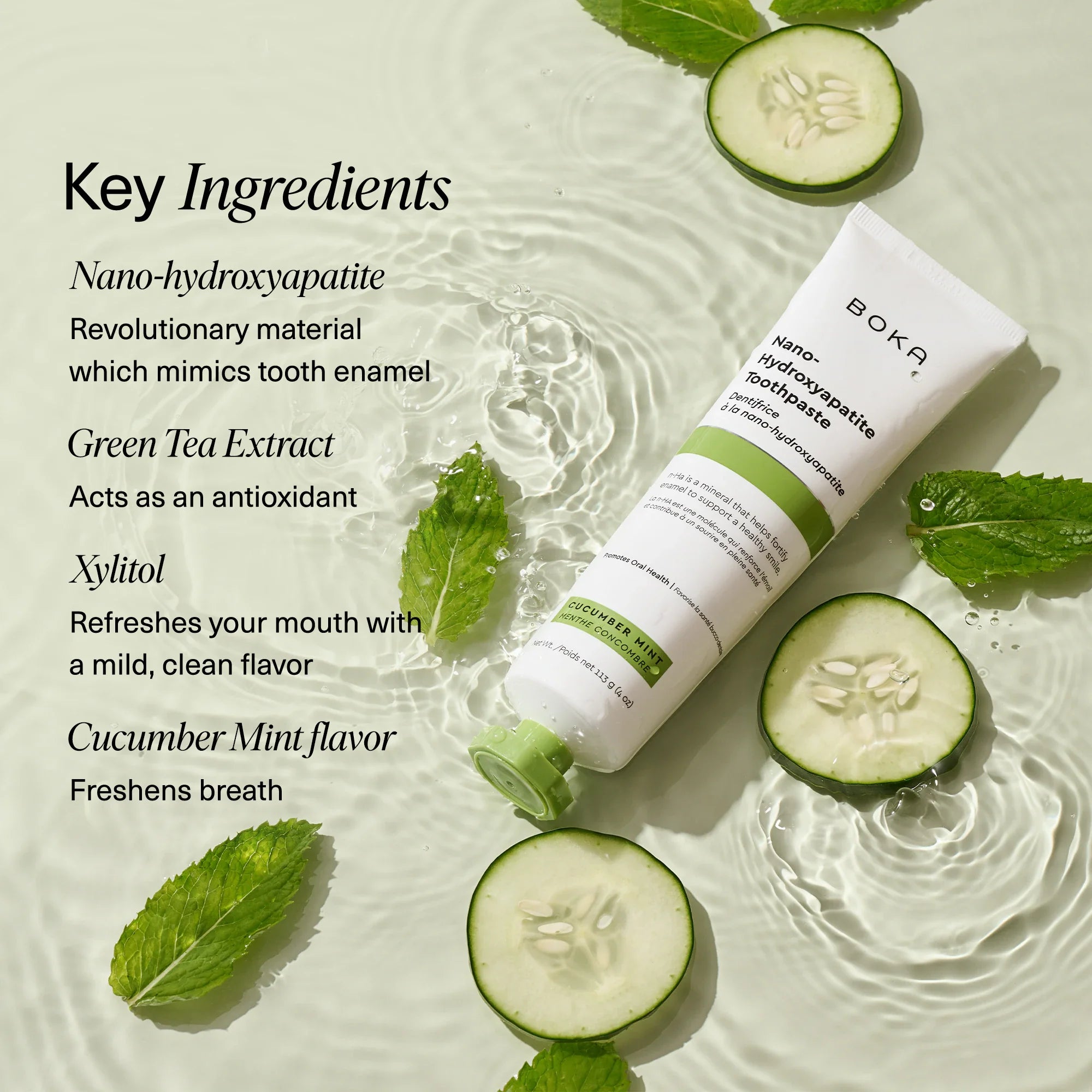 Subtly sweet cucumber blends effortlessly with mint for a revitalizing finish. This power-packed toothpaste trades fluoride for nano-hydroxyapatite (n-Ha) a biomimetic mineral form of the same ingredient that naturally makes up 97% of your teeth material and 70% of your dentin. n-Ha has been the subject of significant research for decades with a wide variety of potential benefits across dentistry and oral care.