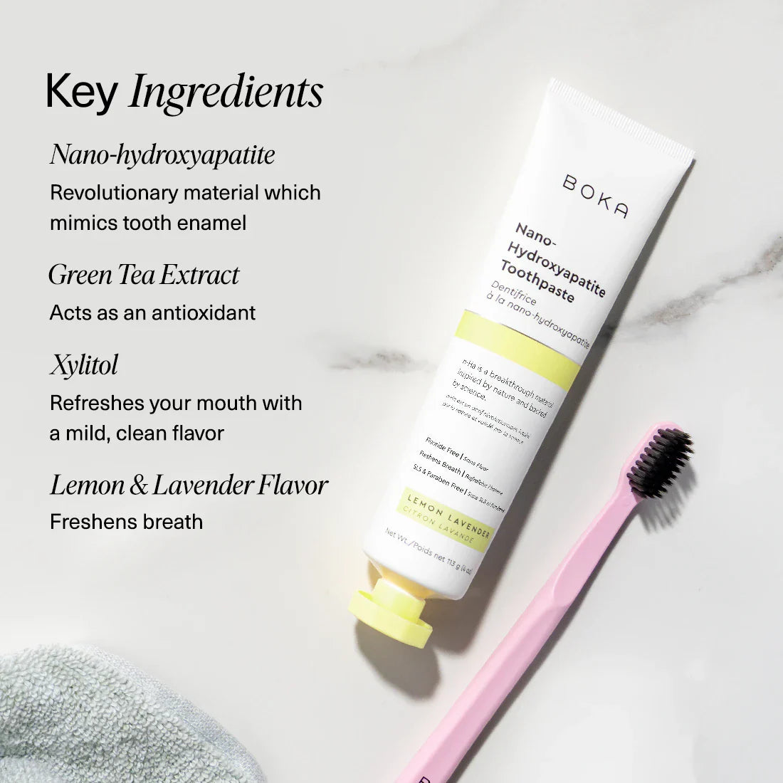 Vibrant, citrusy lemon dances with hints of calming lavender. This power-packed toothpaste trades fluoride for nano-hydroxyapatite (n-Ha) a biomimetic mineral form of the same ingredient that naturally makes up 97% of your teeth material and 70% of your dentin. n-Ha has been the subject of significant research for decades with a wide variety of potential benefits across dentistry and oral care.